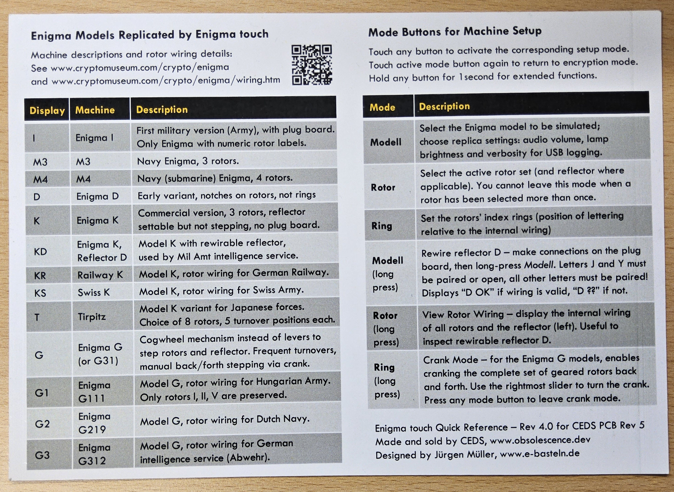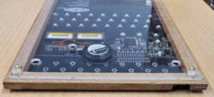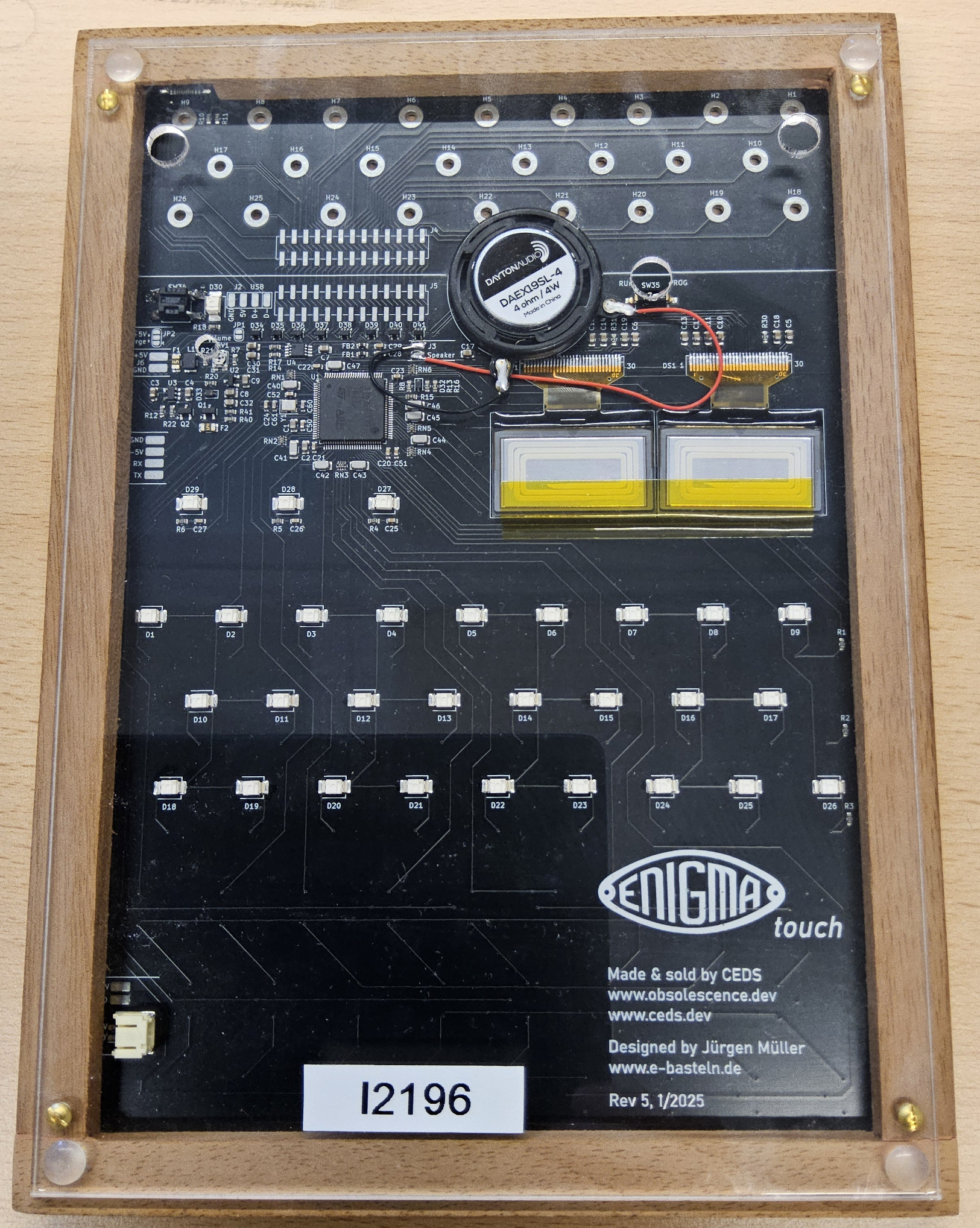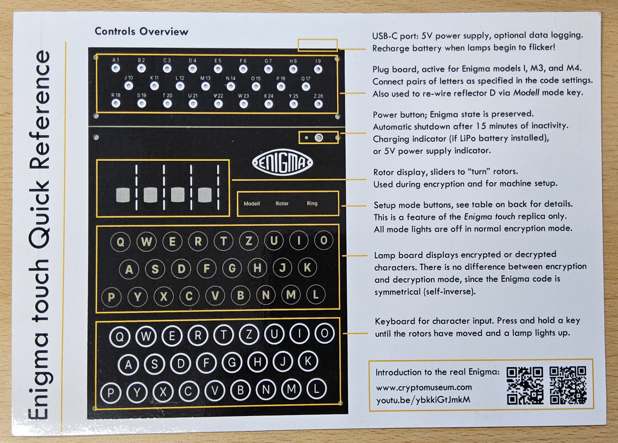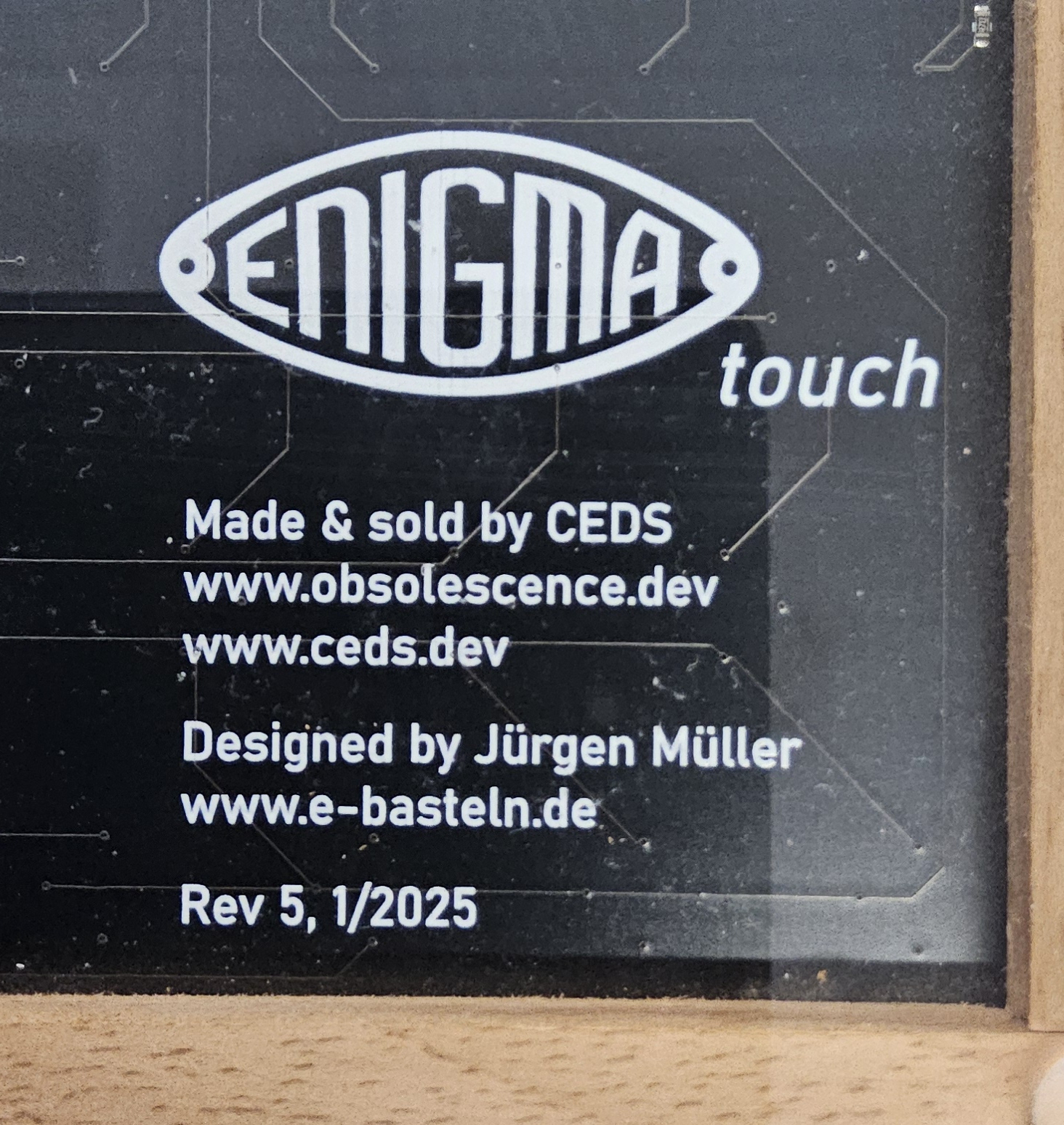 Das einplatinige Design zielt darauf ab, Aussehen und Funktion der originalen Enigma möglichst genau nachzubilden. Die Elektronik auf der Rückseite der Platine übernimmt die eigentliche Arbeit; die Oberseite bildet die Frontplatte im Maßstab 2:3 nach.Der Rahmen ist aus Buchenholz gefertigt.